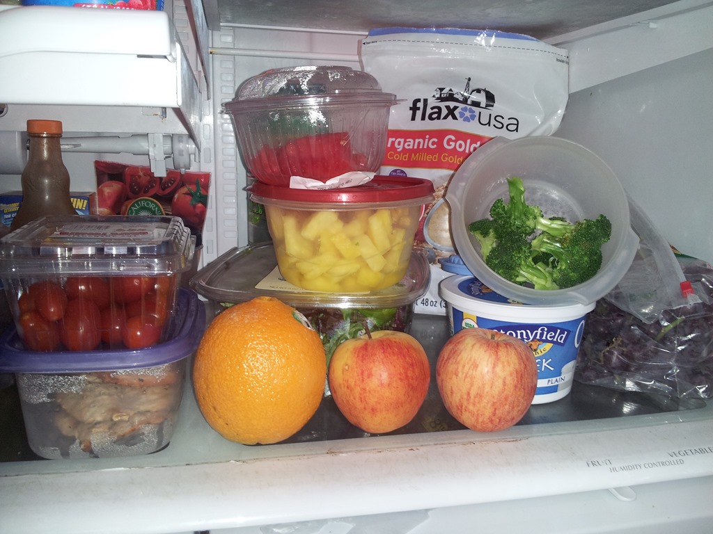 Here is one shelf in my fridge tonight. These are fast foods for myself or my daughter to enjoy with a quick grab. Watermelon, fresh pineapple, blanched broccoli, Greek yogurt, grapes (that need washed yet), chicken boobs… all tasty stuff.